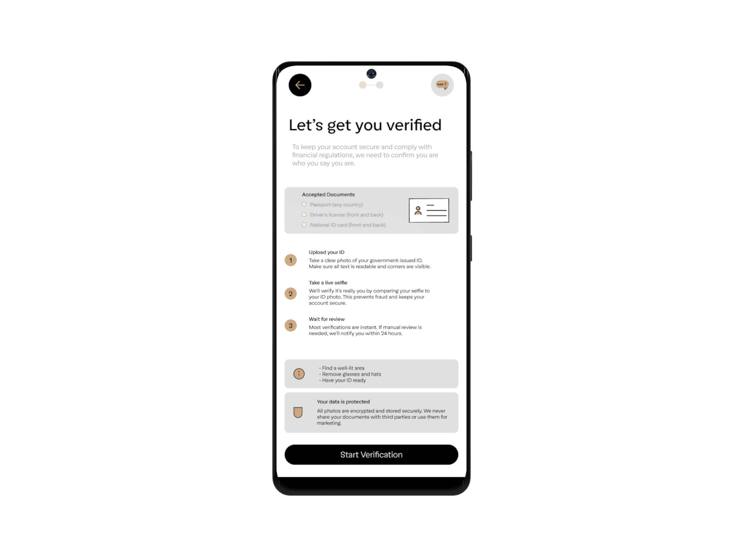 "Upload ID → Take selfie."