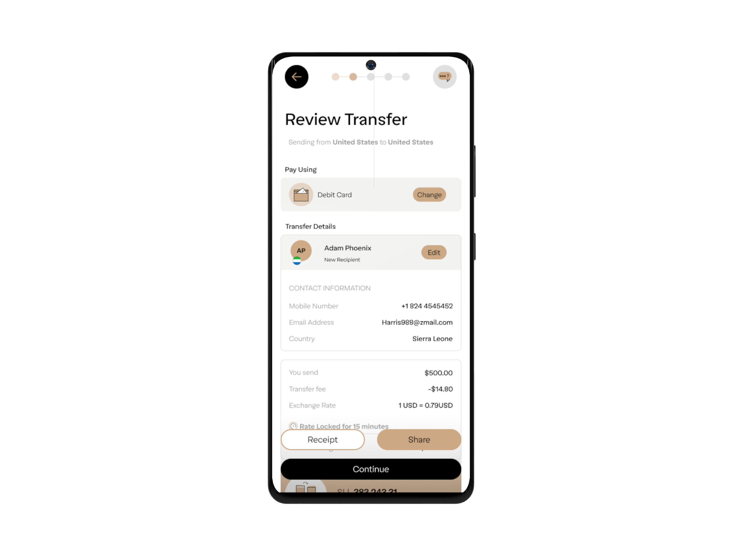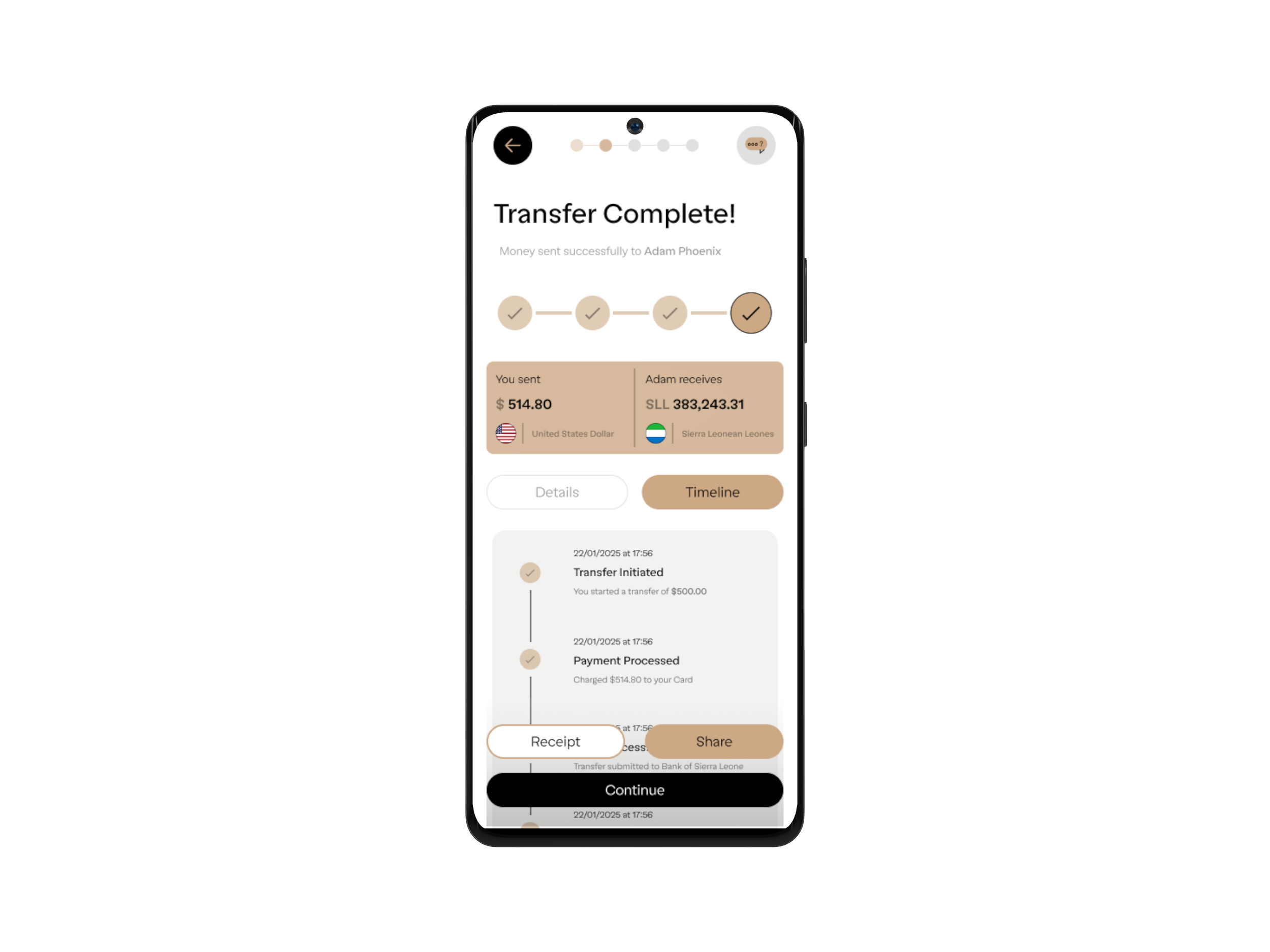 After sending money, users are left wondering if it went through and when it will arrive. The transaction timeline shows exactly where money is in real-time—from initiation to currency conversion to delivery—with timestamps at each milestone. Users no longer need to contact support to check status.