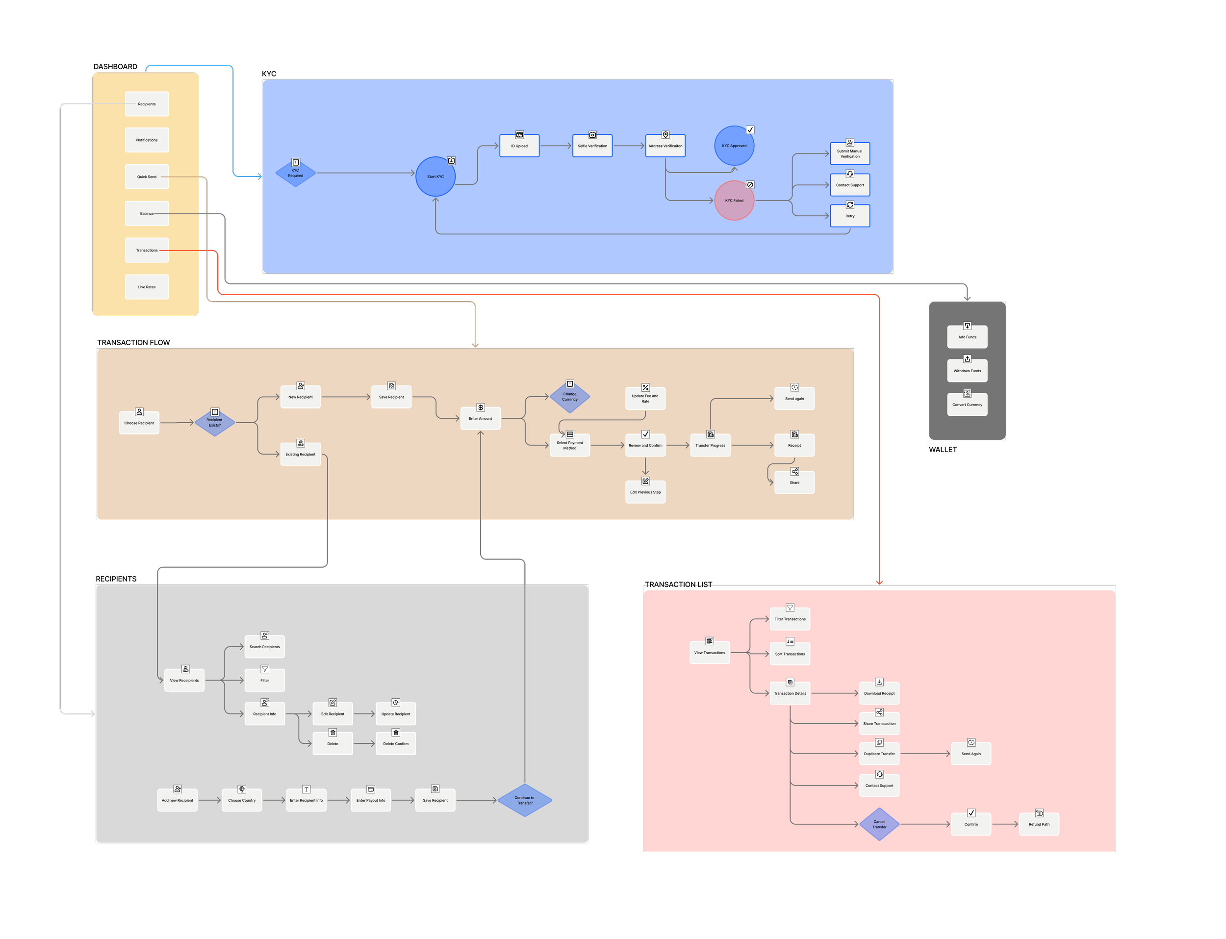 I designed Jaudi's main flows based on three principles: speed, openness, and trust. I did this after talking to stakeholders and looking at the competition to figure out what users needed. The mobile app takes users through a smooth send-money process, from KYC verification to transaction completion, making sure that all regulatory requirements are met without causing any problems. Each flow was set up to help both first-time users who need help and regular senders who want things to go quickly. There were clear progress indicators and information that was only given when it was needed.